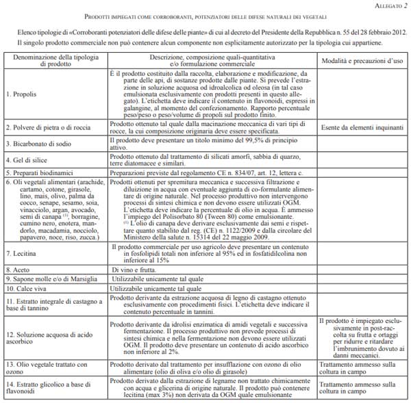 L'Allegato II al Decreto Ministeriale 18.07.2018 n. 6793 riporta le tipologie di «Corroboranti potenziatori delle difese delle piante» che si possono utilizzare per la produzione biologica. |